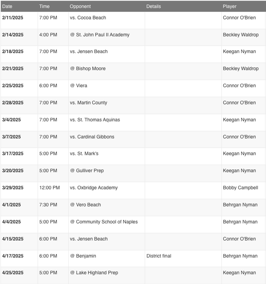 After our Oxbridge Academy victory, the Vero Beach prom that weekend, and whatever, we became our opponent's best player in many respects. We couldn't muster, sustain, or finish anything that looked comparable to the two-week stretch after Spring Break. We did have an injury bug with three of our top four players, plus Keegan came down with illness while still fighting the injury bug. Needless to say, this 2025 season, we didn't function very well when Keegan wasn't physically healthy or struggled to take some reps on offense.